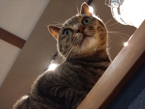 階段の上から、獲物(ネコ用玩具)を狙ってます。
